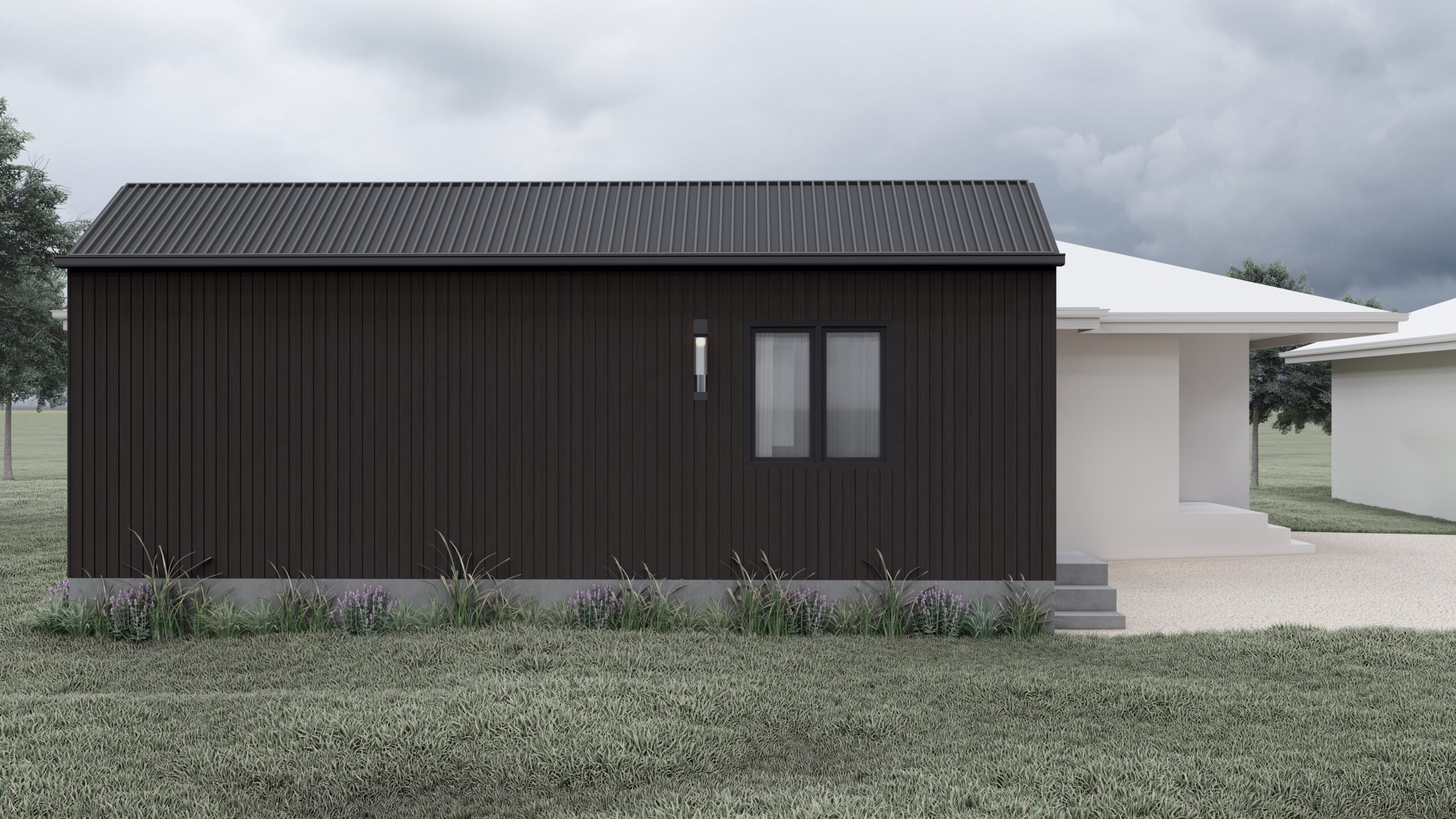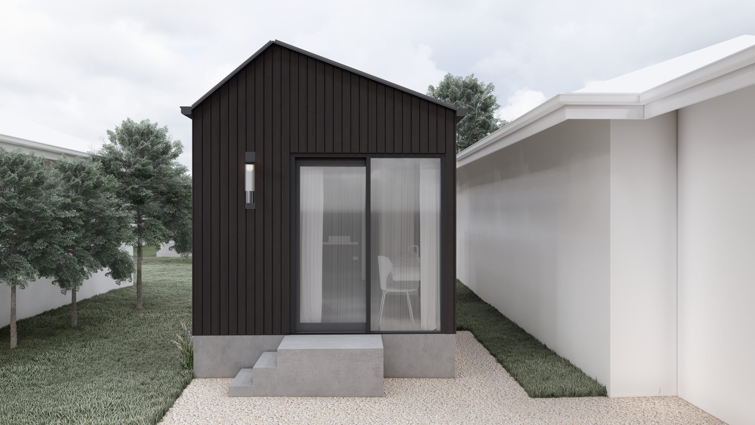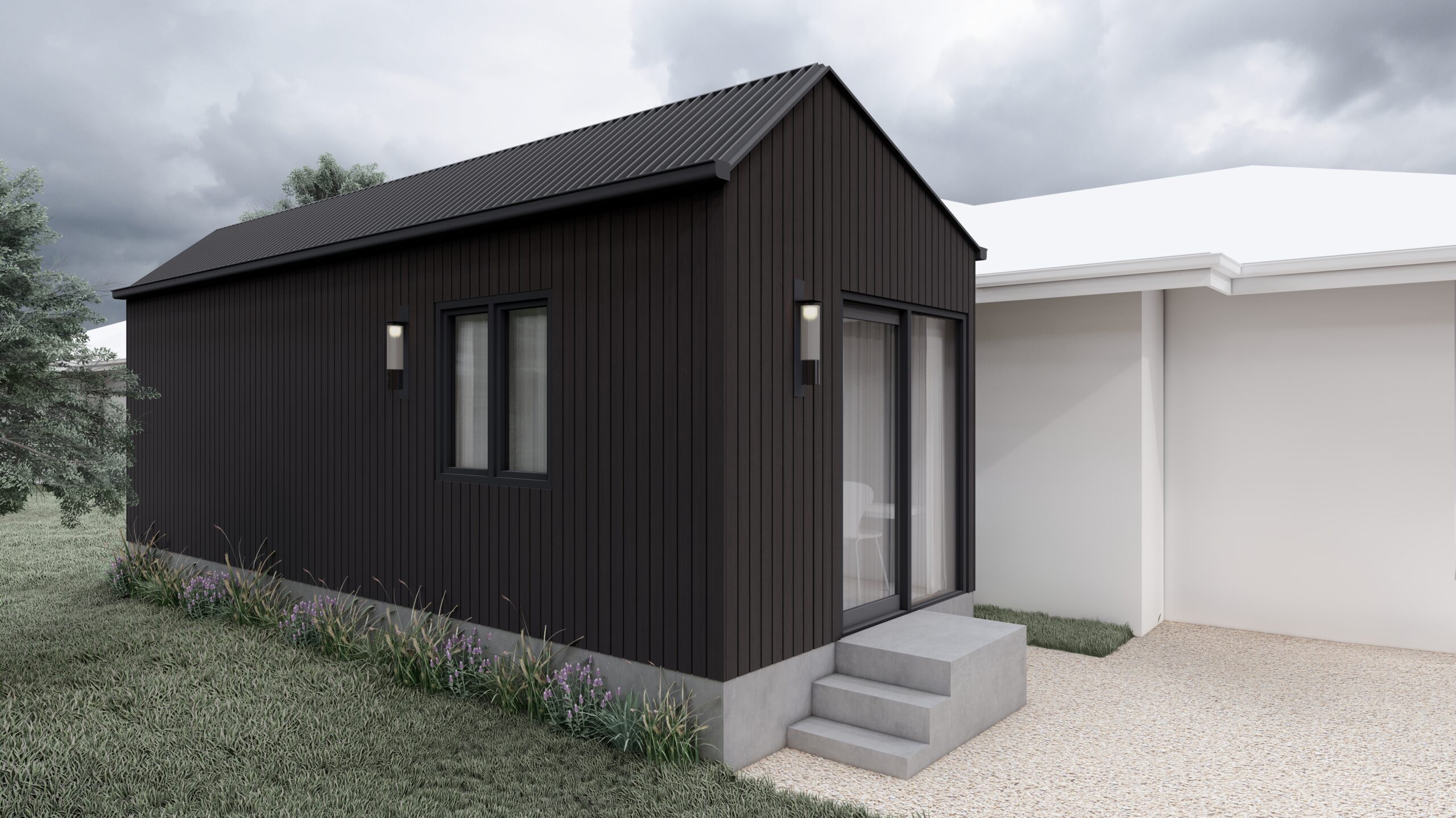 A contemporary secondary dwelling designed as a thoughtful addition to the existing residence. This one-bedroom studio incorporates all essential amenities while maintaining a strong sense of autonomy and spatial clarity.